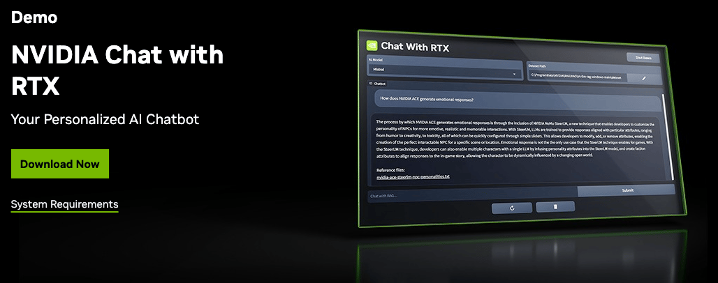 AI chatbot from Nvidia, runs locally on your own PC without needing internet/cloud access, and it leverages Nvidia's leading AI capabilities.