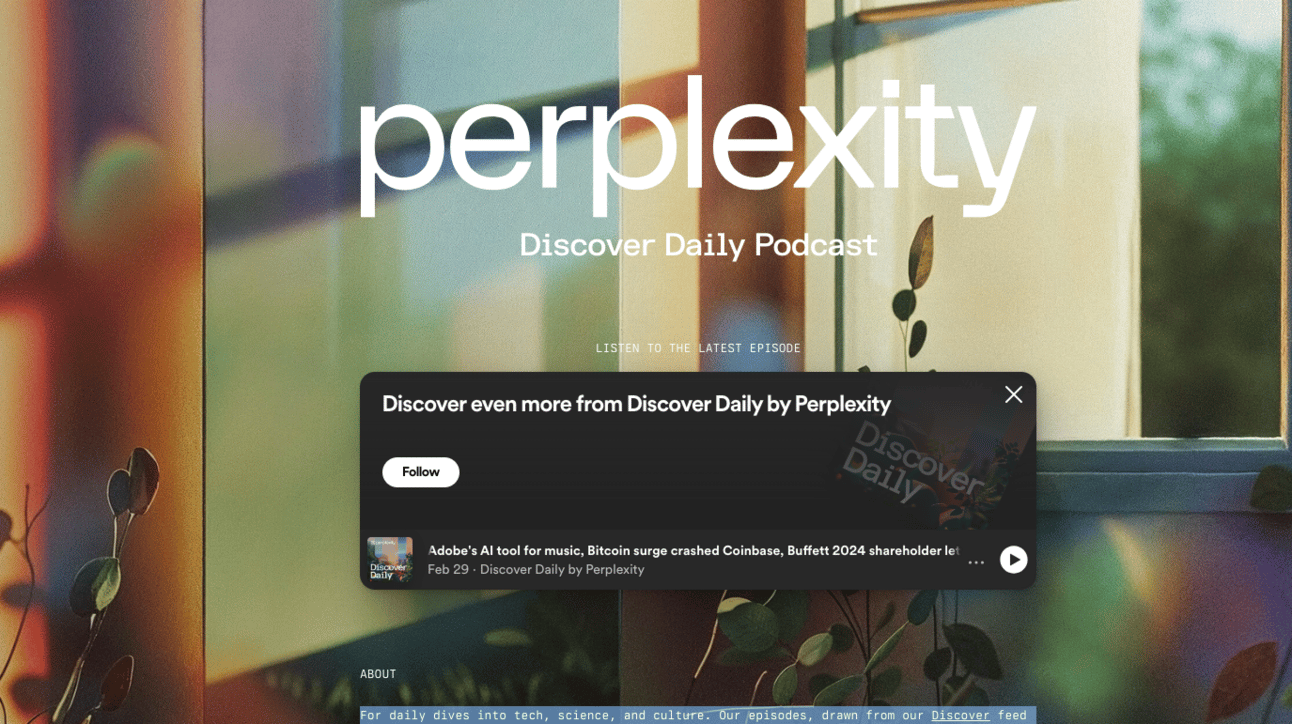 The 4-minute episodes feature synthetic yet natural-sounding voices reading summaries of top headlines from Perplexity's Discover news feed.