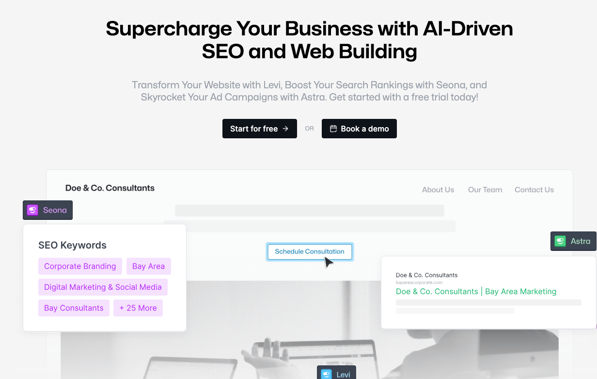 Supercharge your business with AI-driven SEO, web building, and ad campaigns. Transform your website with Levi, boost search rankings with Seona, and skyrocket ad performance with Astra.