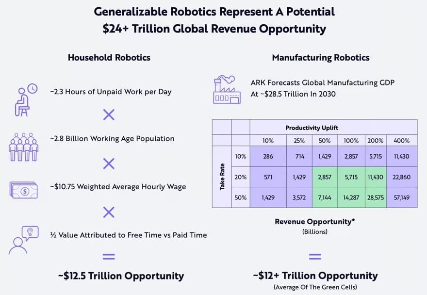 Investment firm Ark Invest foresees a staggering $24 trillion revenue opportunity arising from the integration of advanced AI and computer vision capabilities that will enable robots to operate efficiently in unstructured environments.